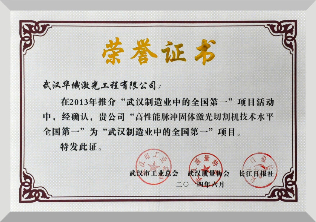 2014年6月11日,三部門共同商議決定對武漢首屆制造業(yè)中的全國第一項目予以表彰。武漢華俄激光工程有限公司的《高能脈沖固體激光切割機(jī)》技術(shù)水平全國第一,得到肯定并獲得頒獎。