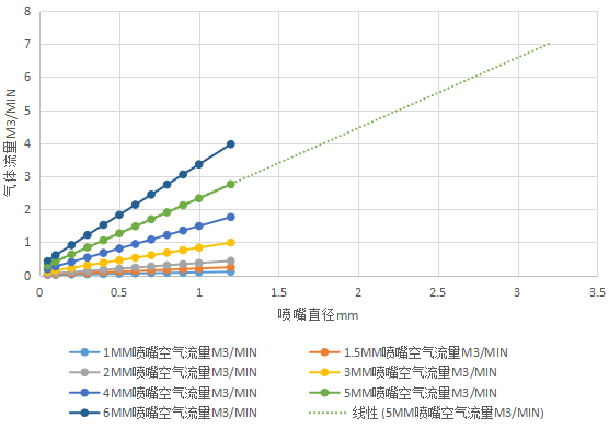 縱坐標為氣體流量測試數(shù)值,橫坐標為調(diào)整設(shè)置不同氣體壓力變化,不同顏色表示的是不同噴嘴直徑的測試條件。從上表圖形可以看出,流量是由設(shè)置氣體壓力和噴嘴直徑?jīng)Q定的,并是線性正相關(guān)性。