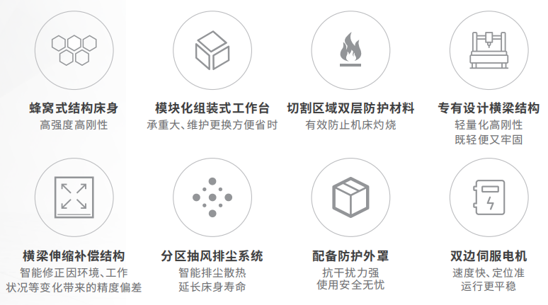 4. 具備掃碼導(dǎo)圖、圖形自動優(yōu)化、高速尋邊、自動調(diào)焦、測焦、閃電穿孔、穿孔除渣、蛙跳切割、飛行切割、空移避讓、氣體沖刷、起刀收刀工藝、斷點(diǎn)續(xù)切、氣壓閉環(huán)、吹氣保護(hù)、高速尋邊、振動抑制自適應(yīng)等功能,還可根據(jù)需求配備視覺余料再生產(chǎn)、自動更換噴嘴、平面坡口等高階功能。